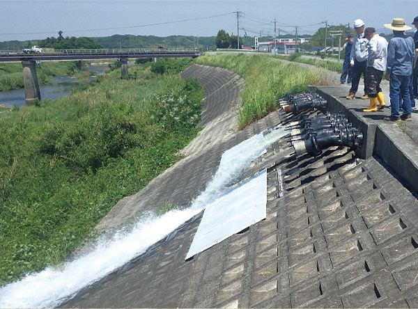 生産工廠的防水災排水泵設備 日本 用作防止工廠淹水的雨水排水泵 在生産玄關用地墊的工廠中,發生颱風和豪雨時,主要因通往河流的水閘會關閉,水道中泛濫的雨水會流進工廠內。爲了防止進水,在水道旁邊建造了蓄水槽,並設置了用來向河流排水的沉水泵。另外,考慮到可能停電,電源使用發電機進行供電。試運行時,用戶確認了排水情况,對最大排水量 4,200m3/h(70m3/min)表示非常滿意。 產品 工事用砂泥泵 型號 : GSZLGSZ5-22-6 [ 10 台 ] 返回一覽